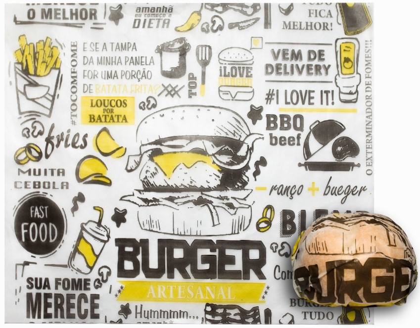 Papel Barreira, fabricado especialmente para contato com alimentos, impermeável, utilizado por grandes franquias como McDonald's, Burguer King, Subway e considerado como o melhor papel para embrulho de lanches.